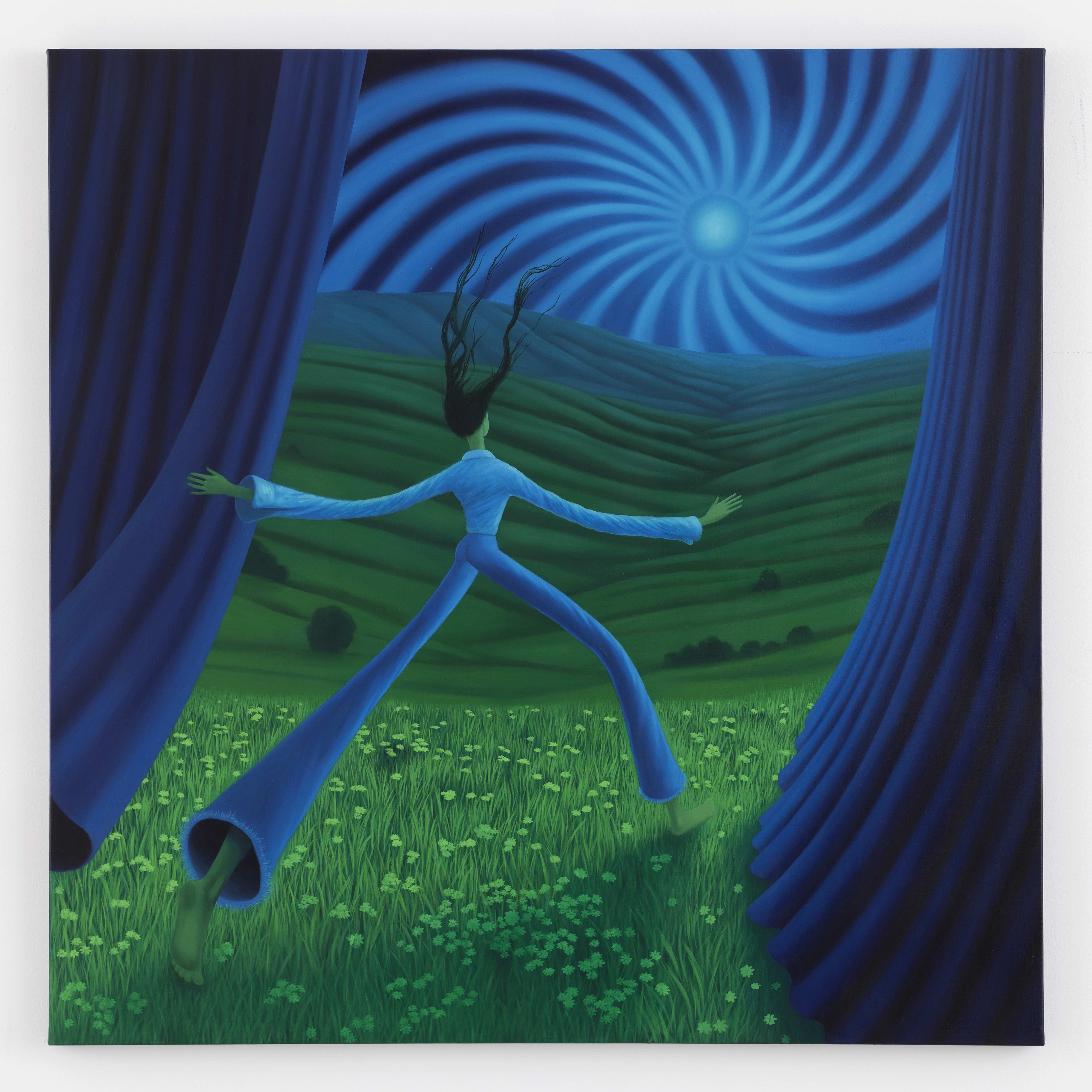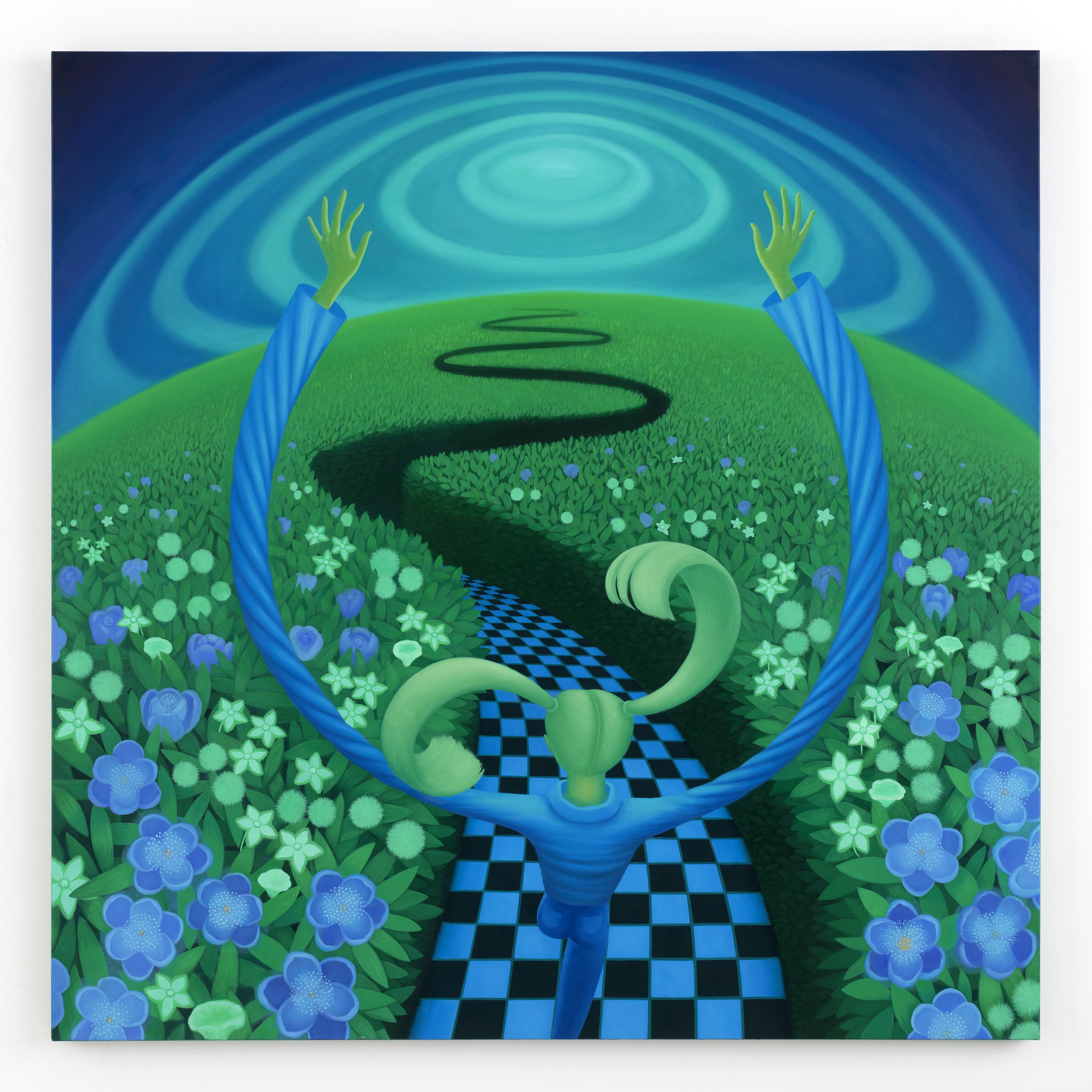 在這個不平靜的一年裡,敏感的創作者心境同樣起伏。Lifshin 的畫面依然充滿明亮的色彩與身體伸展的動態,但主題卻有了轉折:作品不再只是她最標誌性的巨大伸展姿態,而是引入廣袤的自然空間——無垠的花床、無盡延伸的路徑、帶領觀者走向山巔的構圖、縱身躍進的身影。她全心投入,一次次深掘細節,內心的探索卻並非筆直的一條路,而是曲折迂迴、柳暗花明。這份幽微正是本次展覽畫作的核心,是她嶄新的且成功的一次嘗試。