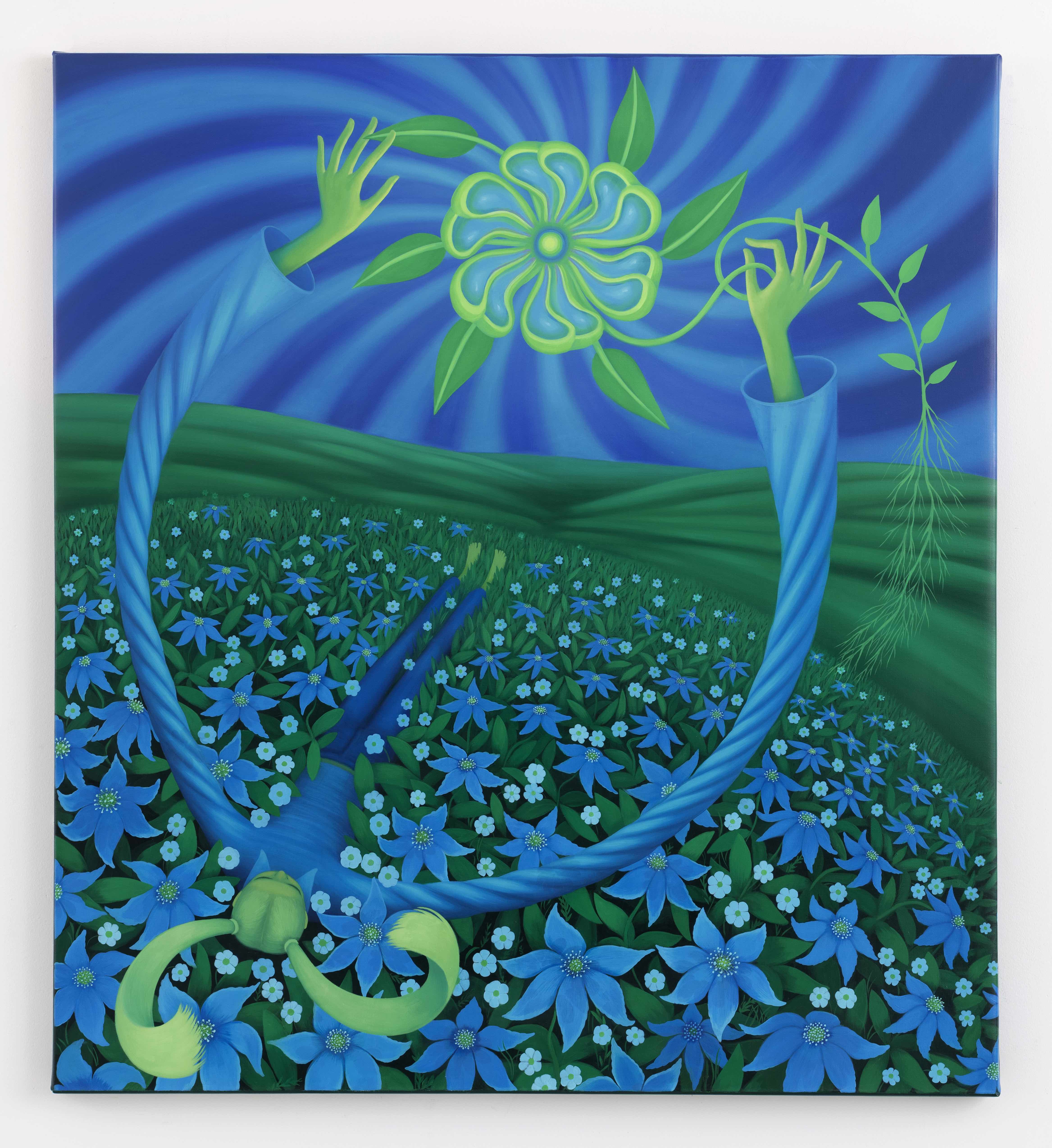 在此次展覽中,Lifshin 特別琢磨透明感的表現:Portal 一作前景中步道上似有腳印,Flower Diver 更有大面積半透明的渦旋,都展現她對「空氣感」、「輕盈」、「全面投入」的追求。她持續使用高飽和度的藍與綠,以及兩色之間的光譜,如今隱晦的表達方式使虛與實之間增加更多層次,開啟更大的想像的空間。觀賞 Floral Dive暫時脫離重力,進入無邊界的漂浮,與 Katia Lifshin一同感受內在共振。